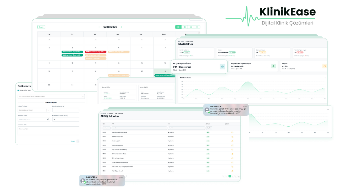 Klinik Ease ile klinik yönetiminde tüm kontrol sizin elinizde. Danışan takibi, randevu takvimi, stok ve ödeme süreçlerini zahmetsizce takip edin.