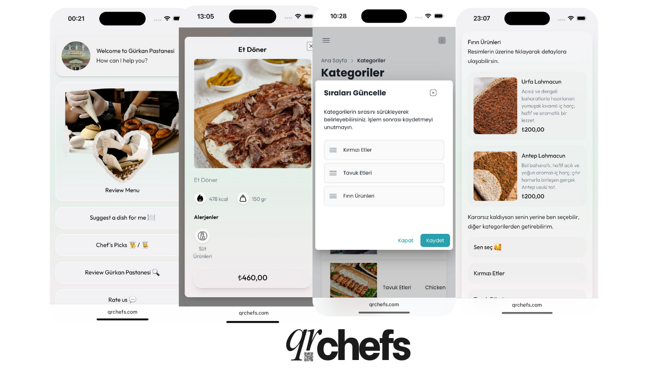 QR Menü çözümleri sunan QRChefs ile alışılmışın dışında bir menü deneyimi sağlar. Yapay zeka sohbet görünümlü menü ile müşterilerinize etkileşim katın.
