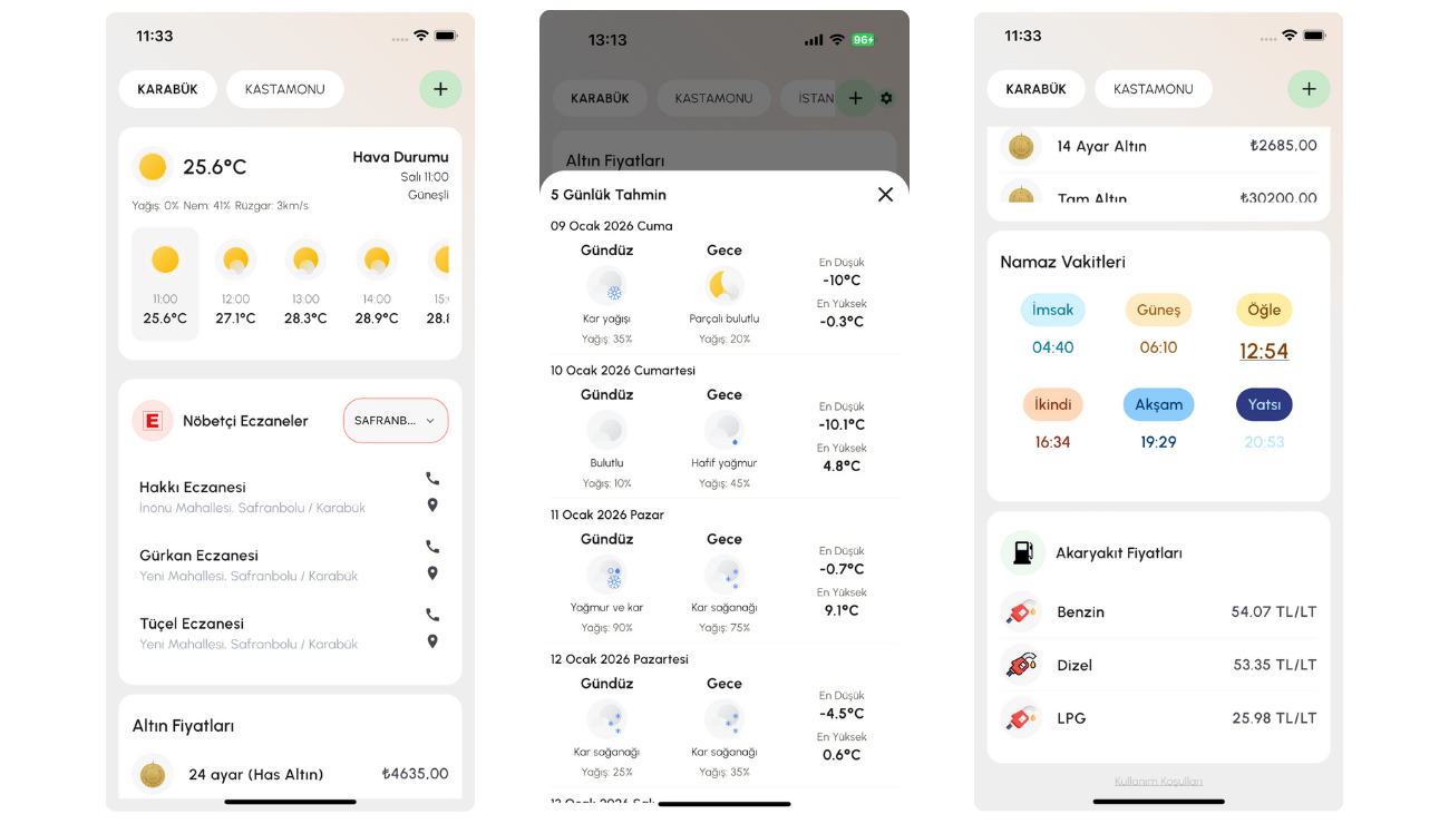 Şehrinizin hava durumunu öğrenin, nöbetçi eczane bulun, namaz vakitlerine ulaşın, akaryakıt ve altın fiyatlarını anında tek uygulamadan takip edin.